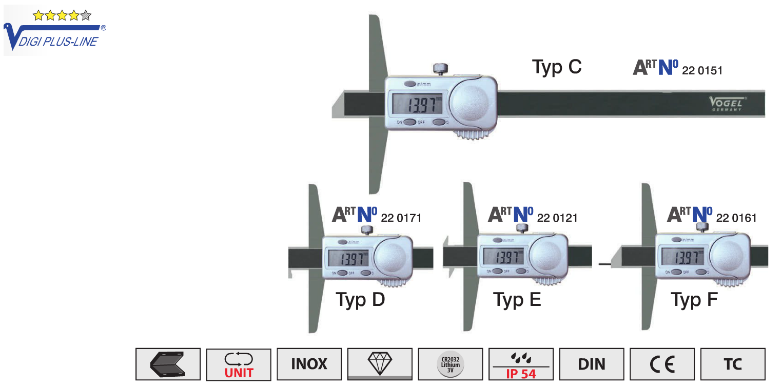 Цифровой штангенглубиномер  с водо-пылезащитой IP 54 и c разными типами наконечников